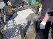 Дожидаемся высыхания бетонной плитки, затем проверяем её на прочность. Покрытие не поддаётся внешнему воздействию, а значит цемент успешно застыл и плитка надёжно зафиксирована на могиле. Фотографируем окончательное состояние места захоронения.