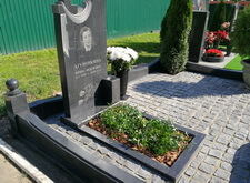 На нижеприведённых фотографиях представлен окончательный вид места захоронения. Мы поставили на место памятник, сделали цветник, уложили внутрь участка гранитную брусчатку. По периметру места захоронения проходит старый цоколь, на этот раз укреплённый на надёжное и добротное основание. В правую половину участка высадили две туи (одну в специальную клумбу, другую в пластиковую кадку), в цветник поместили барвинок. В таком виде объект был представлен клиенту, который остался очень доволен проделанной работой.